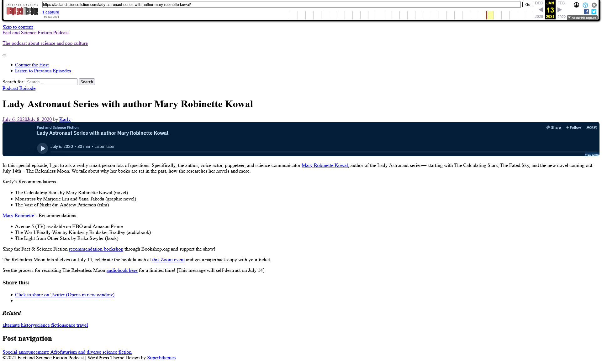 In which Mary Robinette reads an excerpt from The Relentless Moon and then talks about the most difficult parts of the research she did for the book, the key differences between the Lady Astronaut timeline and our own, and her favorite sci-fi reads of the moment.